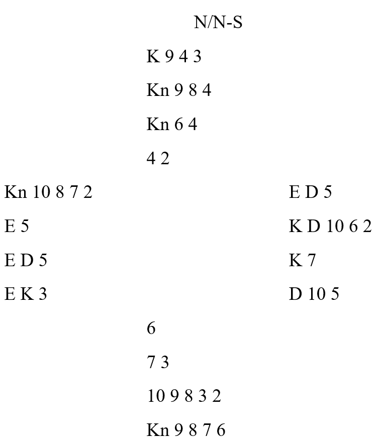 Så kom kløver konge i diagramsituasjonen. Vest som hadde ruterlengden hadde kun en hjerterhonnør og var ikke skviset. Toppspilleren Jansma så selvsagt at han måtte blanke hjerter konge for å holde ruteren idet det siste kløverstikket ble tatt fra syd. Siden ruterfargen ikke gikk ble det ett stikk for lite og en bet.