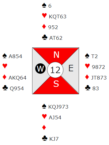 Her er det vest som er giver, og merk, Ø/V er i gunstig sone. Vest åpner normalt med 1 ruter. Da har øst fine kort til å hoppstøtte med (3 ruter) hvis han får anledning til det, og en slik melding er avtalt som sperr. Hvis man får meldt sånn er det ikke så enkelt for motparten å finne ut sikkert hvordan det ser ut, og de må gjette. Men i dette tilfellet har vel nord en innmelding 1 hjerter selv om det er i sonen? I så fall endrer syds kort seg fra gode kort til monsterkort! Men å finne ut alt er ikke enkelt likevel, spesielt om Ø/V er aktive som soneforholdene innbyr til.