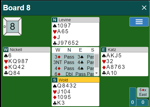 Da Ø/V hadde meldt seg opp i 6 ruter doblet Levine (nord). Det hadde startet med 1 hjerter - 2 ruter, og doblingen var Lightnerdobling, dvs. bordets først meldte farge skal spilles ut. Syd spilte ut hjerter knekt til kongen og esset. Tilbake kom en kløver, og Katz stakk med esset. Han var nok litt lettet over at det ikke kom hjerter tilbake til stjeling. Nå handlet det om å finne hjerteren, om det da ikke trumfen sitter 4-0 slik at det ikke er noen mulighet til å vinne kontrakten. Trumfen satt 3-1 med singelton hos nord. Hvordan tror du hjerteren sitter? (Husk knekten og esset har gått)