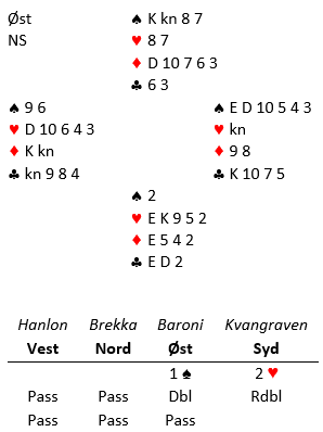 Ps. Hanlon kunne beitet kontrakten ved å vri kløver (eller ruter) etter hjerter dame. På den måten beholder han et frikort og ødelegger mitt tempo til å korte meg samtidig som jeg setter opp trussel med 2 inntak hos nord i ruter.