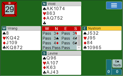 En hjertertaper går på kløver ess. Den andre hjertertaperen blir det normalt vanskelig å bli kvitt. Så spar og ruter må ordne seg uten taper. Noen sa (på BBO) at begge fargene må sitte 3-2. Det er bare vrøvl. La oss si det kommer hjerter ut til esset. Kløver ess gir hjerteravkast. Nå spilles spar til esset og spar til damen. Hvis øst har knekten fjerde blir det bet. Men om vest har trumfknekten fjerde fiskes den opp (markert finesse etter to runder trumf), og da må ruteren sitte 3-2. Men om trumfen sitter 3-2 er det en sjanse slev med 4-1. Da stoppes uttrumfingen etter to runder. Så to store ruter. Hvis fargen sitter 3-2 tas den siste trumfen ut og resten står foruten det hjerterstikket de må få. Men om ruter sitter 4-1 har du med denne spilleføringen fortsatt en sjanse. Han som har singel ruter kan ha startet med dobbel trumf. Så han med fire ruter kan altså ha den uteværende trumfen og følge farge i ruter idet en tredje ruter tas, og en fjerde runde ruter trumfes med syds siste spar. Så kløver til stjeling, ut med den siste trumfen og ruterkvisten står. Så det er muligheter med 4-1 sits enten i trumf eller og i ruter. Det er riktignok en nokså hardmeldt slem hvis man prøver den, men sjanserik.