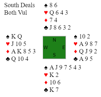 Nord spiller ut spar 8 mot vests 3NT. Syd ligger unna med esset, og vest vinner med kongen. Syd håper at vest har K-Q dobbel i spar. Hvis syd (eller nord) kommer inn tas i så fall for spar ess og alle sparene står. Men vest setter i gang med ruterfargen. Makker (nord) følger to ganger, så siden vest har femkorts farge må syd planlegge tre avkast. Nord hjelper til så godt han kan og legger styrke i hjerter. Syd vet at nord nepper har noe særlig mer.