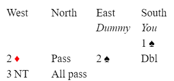 Her er et spill fra en lagturnering i helgen hvor motspilleren på syds plass så optimistisk på det tidlig i motspillet, men så ble han utsatt for et voldsomt press. Da er det om å gjøre for motspilleren å finne ut raskt hvordan det ser ut og forsøke å villede spillefører. For i sånne spill dreier det seg for spillefører ofte om å "lese" sitsen mot slutten.