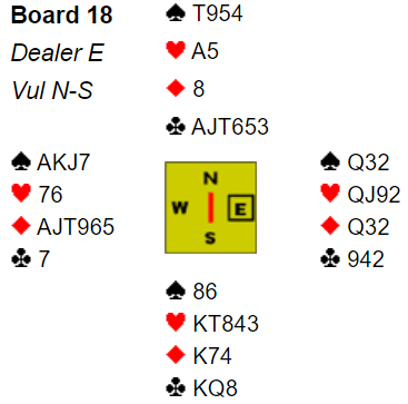 I min forhåndsskrevne omtale av spillene gjettet jeg på at å melde lilleslemmen som i praksis er nedlegg ville gi bra spill, men de som var i 6 hjerter og fikk de tolv stikkene som er der fikk kun strø over middels. Det var en rekke +1010 for tretten stikk, alle hvor kontrakten ble spilt av nord. Da måtte øst finne ruter i utspill for å få poeng. Tretten stikk i slem ga nesten 80% til N/S.