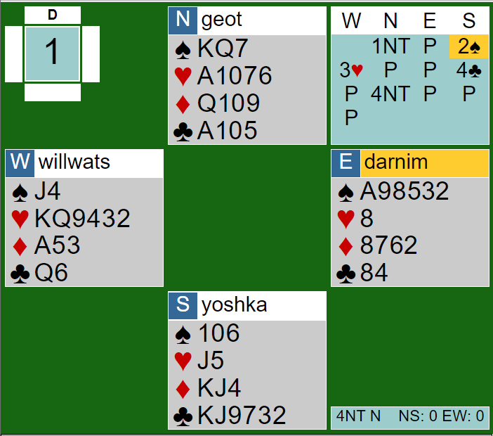 Over 4 kløver var jeg helt rådvill, visste ikke engang om syd var sterk eller bare konkurrerte med 4 kløver. Jeg turde ikke annet enn å si 4NT, forslag til å spille der. Det gikk pass rundt.