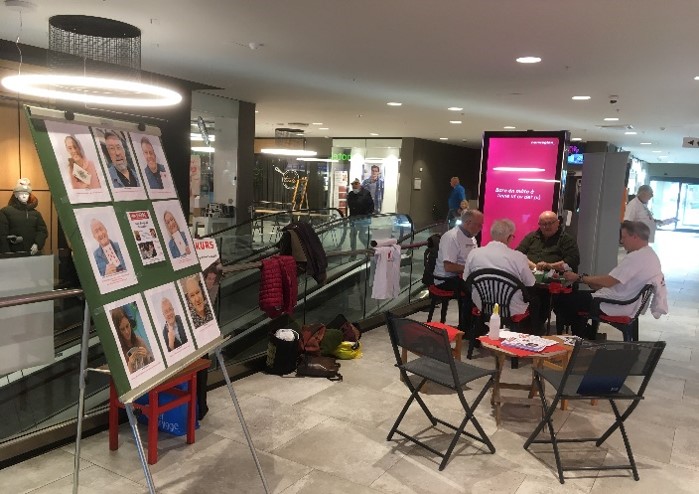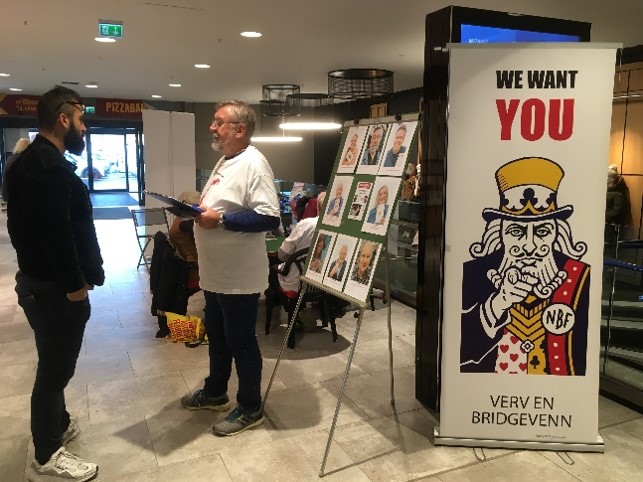 Men vi ville ikke stoppe der. Klubben har tidligere lyktes godt med å avholde stands for å skape oppmerksomhet om «Bridge – et spill for alle». Det ville vi nå gjenta, og vi fikk tillatelse til å holde en «Rekrutteringsstand» på Tangen Senter lørdag 30.oktober. Mottoet for standen var «Spill bridge på Nesodden!». Plakater med bilder av spillerne våre, samt plakater og roll-ups utlånt fra NBF, ga en fin oppmerksomhet om hva standen dreide seg om.