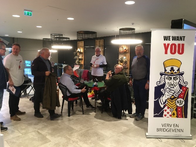 Heldigvis hadde vi fått tillatelse til å ha standen midt i den mest sentrale delen av senteret. Det var en fordel, men det betød ikke at arbeids-forholdene dermed var veldig enkle for våre «ververe». Som vanlig hastet folk fram og tilbake, og det var nok ikke alle som var forberedt på å stoppe opp for å ha en prat om bridge. Det var først og fremst medlemmene våre som sikret at denne standen ble en stor suksess. Vi hadde på oss «uniform» - T-skjorter fra NBF, og skiftet på å snakke med folk, og å ta «time-out» ved bridgebordet med kaffe og gode bridgeopplevelser med nye makkere.