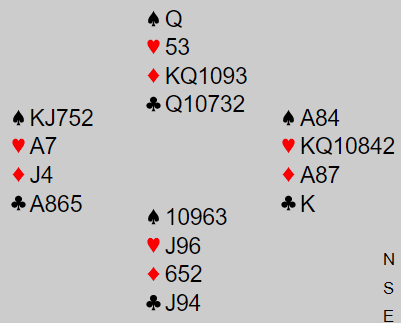 Vist fikk ruter 2 i utspill fra syd til nords dame og esset mot 6 hjerter. Da er antagelig beste spilleplan å gi bort ett stikk i ruter, så stjele en ruter hos vest og etterpå ta ut trumfen. Det kan vel bli feil om det er en trumftaper (hjerter) siden å gi bort ruterstikket i så fall fører til en sikker bet (i så fall en trumftaper, men her satt jo trumfen greit). Og kanskje sitter det slik at hun kunne blitt kvitt to ruter og tapt kun ett hjerterstikk.