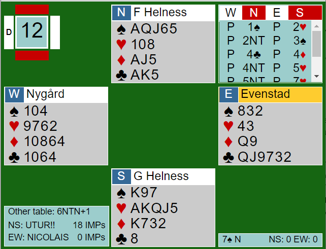 Ved det andre bordet oppvurderte nord til 20-21 NT, ikke urimelig med 19 og god femkorts farge. Pussig nok ble det vanskeligere å finne storeslem etter 2NT i åpning enn etter 1 spar. De endte i 6NT, så spillet kostet 12 IMP.