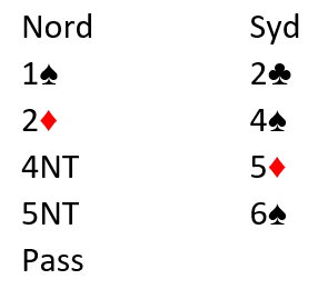 Meldingene kan sikkert diskuteres, men her har syd kun sagt at han har sånn akkurat nok til utgang, typisk med tre-korts spar. Med fire+ kort i trumf og utgangskort melder de fleste Stenberg 2NT. Uansett, så lenge nord får vite at syd har såpass med verdier og trumftilpasning går hun på til slem.