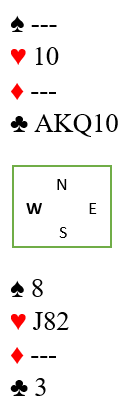 Spar 8 spilles med avkast av hjerter 10. Som du ser blir det kun fire kløver igjen hos nord. Hvis en av motstanderne var utstyrt med kløver knekt minst fjerde sammen med hjerter konge fra start er han ferdig. Ingen kan ikke holde fire kløver og hjerter konge med kun fire kort igjen.