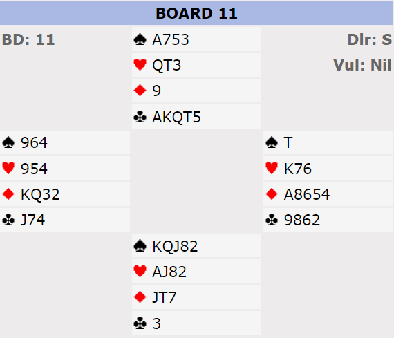 Claimeren som ble avhengig av kløver knekt tredje (!) fikk altså også tolv stikk. Og når regnskapet skal gjøres opp er +980 verd akkurat det samme om du har spilt på en 15-20% sjanse som om du har spilt perfekt å fått med alt, la oss si 80% vinnersjanse.