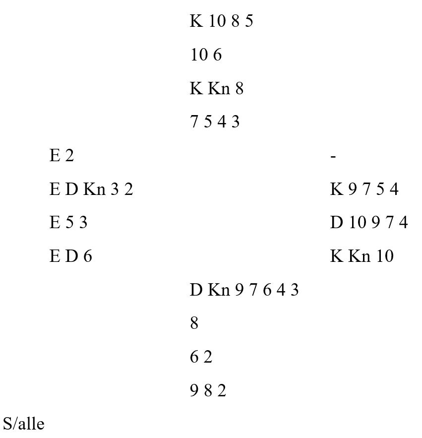Nå skal du jo bare ta ut trumfen, men skrekk og gru - den sitter 4-1 i mot. Hvis du nå trekker fire trumf så kan motparten ta haugevis med beter i kløver inne på hjerter. Hvis du heller tar to trumf, oppdager misæren, og deretter går over på hjerter - ja, da kan vest gi makkeren sin ruterstjeling. Og selvfølgelig, hvis du forsøker å avblokkere ruter knekt før du går over til hjerter - ja, da stjeler også øst. Her har du rett og slett gitt deg sjøl ris til egen bak, og burde ha gått ei fortjent bet!