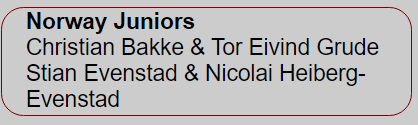 Vinnerlagets lagnavn er altså Norway Juniors. Og lagets spillere har en lav snittalder selv om Stian drar snittalderen kraftig opp (sorry Stian, men det er bare facts...). Men navnet lyver litt selv om de tre andre er unge spillere. For både Christain Bakke (nettopp fylt 26) og Tor Eivnd kan ikke kalle seg juniorer lenger. Men det kan Nicolai som vil være juniorspiller i 11 år til!