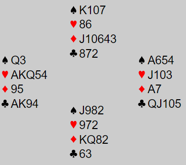 Syd åpnet med 1 kløver, og hele spørsmålet for Nord er nå om makker har tre ess eller ikke. 12 av 13 Nordspillere tok ikke sjansen på å finne ut om de tre essene var til stede, av frykt for at makker kanskje kunne ha bare ett, slik at det kunne bli bet i 5 spar. Syd hadde ikke et eneste bortkastet kort i form av en knekt, dame eller konge, og resultatet ble 480 ved 11 av de 12 bordene( ett par endte i 5 kløver).