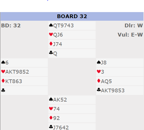 Ved det andre bordet meldte ikke øst. Dermed fikk N/S fredelig spille 4 hjerter hvor det var ti stikk (det tapes to ruterstikk og en ruter til stjeling - med beste motspill).