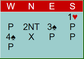 Merk at selv om motspillet mot 4 spar doblet skulle gå for eksempel spar ess, hjerter til kongen, kanskje ett kløverstikk og så spar derfra står 4 spar likevel. Da får ikke spillefører trumfet to hjerter hos vest, men han kan i stedet spille god ruteren.