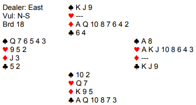 Jeg satt nord med dette. Øst åpnet med 2 kløver, sterkt/utgangskrav. Syd passet, og vest sa 2 ruter. Jeg hoppet til 4 ruter som sperremelding, og øst sa 4 hjerter. Da meldte makker på syds plass 5 ruter og vest 5 hjerter. Nå hadde ingen noe å tilføye. Spillefører gikk to bet (kunne greid seg med en bet), men +100 var normalt ikke noe å bli rik av for oss slik hele spillet så ut: