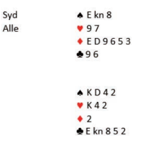 Vest kunne ta fire kløverstikk. Fra nord kastet da Geir en spar og hjerter dame. Det ble igjen disse fem kortene hvor øst fortsatt hadde stopperne sine: