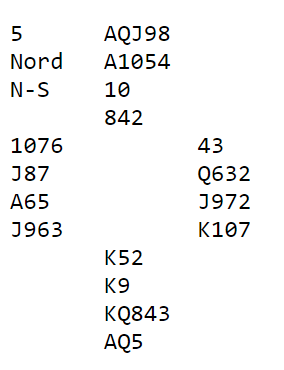 Vi tar med et spill fra turneringen. Det handlet om hvor optimistisk man var, men også om hvordan kortene satt fordelt. Spillet er fra klassen 15-19 år, og paret som var så uheldige å miste førsteplassen med minst mulig margin gjorde det skarpt i dette spillet.
