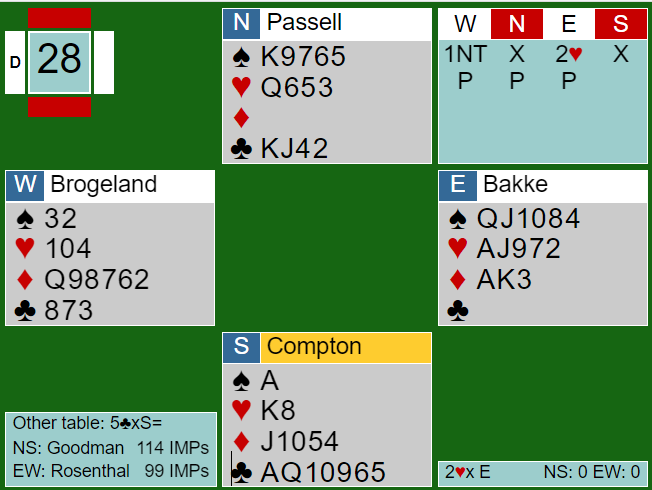Mot østs 4 hjerter spilte Compton ut ruter ess og fortsatte fargen til damen, kongen og stjeling hos spillefører.