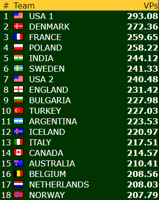 * På grunn av en summeringsfeil i regnskapet har Norge fått med seg for lite vinnerpoeng fra kampen mot Brasil, og har i realiteten nesten 3 VP mer. Riktig totaltscore for Norge etter 21 av 23 runder er 237,07 VP, og dermed holder Norge i realiteten åttendeplassen før de to siste rundene.