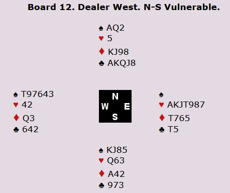 Boye i syd fikk vite at makker ikke hadde hjerterstøtte, men fikk senere høre at makker hadde ess-konge-dame spar, samt hjerter konge. Dermed var det gode muligheter for at hjerteren kunne godspilles for tretten stikk, og Boye meldte storeslem i spar.