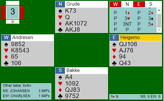 Bakke-Grude stoppet i 5 ruter. Da de viste seg at det måtte bli kløvertaper så det ut som om de hadde gjort det riktige, et mulig gevinstspill hvis motpartens N/S presset på for hardt? Dessuten kan det jo være mulig å havne i 3NT også, og den går bet med hjerterutspill.