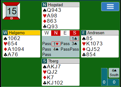 Hogstad-Øberg havnet i 4 spar etter åpning 1 kløver og svarhånden (nord) viste sparfarge.