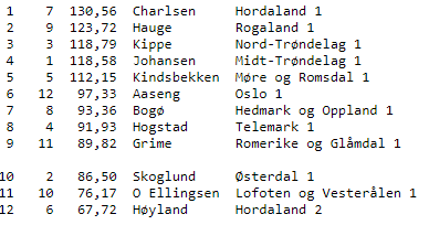 Hordaland/CHARLSEN har grepet på dette, men det er på ingen måte over. De har 5,2 VP mer enn Nord-Trøndelag/KIPPE som sammen med Midt-Trøndelag/JOHANSEN (9 VP bak lederlaget) ser ut til å være de som kan fravriste Hordaland/CHARLSEN gull. Da må det sikres stor seier i egen kamp i tillegg til litt hjelp fra Møre og Romsdal/KINDSBEKKEN som spiller mot lederlaget.