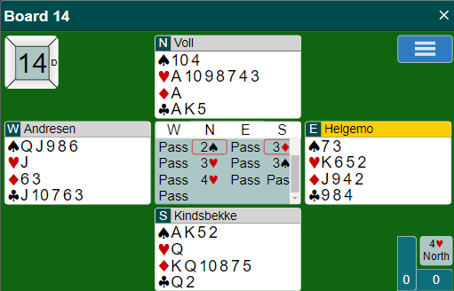 Helgemo-Andresen fikk fatt i beten mot 4 spar etter trumfutspill. Inne på kløver ess skiftet vest til hjerter 6, og da både hjerter konge og ruter ess satt feil ble det en taper i hjerter og kløver samt to tapere i ruter.