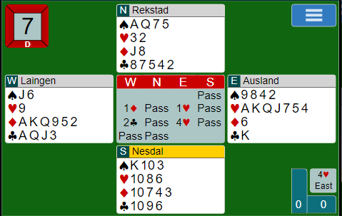 Med Kragerø som Ø/V ble det altså meldt 4 hjerter som er korrekt, og det ble elleve stikk etter sparutspill fra syd.