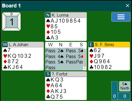 Kristoffer Hegge (syd) hørte altså 4 spar i åpning fra nord. Da går det an å være "scientific", men kanskje litt pga. kort tid for å avtale system og alt det der siden makkeren var kalt inn som reserve, så gjorde Hegge det enkelt og meldte 6 spar.