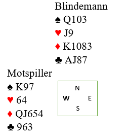 Ved det bordet jeg satt nord og var blindemann spilte vest ut kløver 3. Spillefører la liten og øst vant første stikk for damen. Tilbake kom trumf som gikk til bordets nier. Hjerter knekt ble stukket over med damen før spillefører tok for hjerter ess, og øst fulgte med tieren i tredje hjerterrunde.