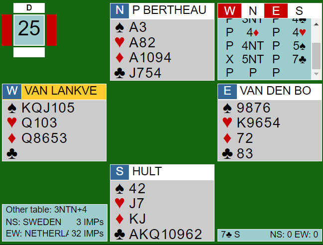 Siden det ble bet i 7 kløver og +520 til N/S ved det andre bordet kostet spillet 13 IMP for Sverige. Om det svenske paret hadde stoppet i 6 kløver villet det blitt 9 IMP inn i stedet, 22 IMP i sving på ett spill.