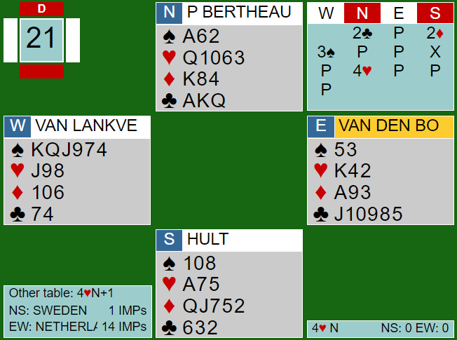 Vest hadde ved begge bord hoppet inn med 3 spar som sperr, og både Nederlands og Sveriges N/S-par kom altså i 4 hjerter med nord som spillefører.