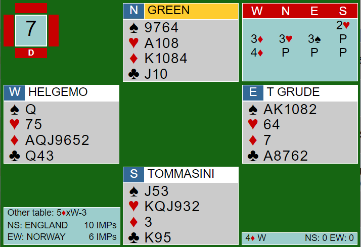 Ved det andre bordet spilte Helgemo (vest) 4 hjerter etter å ha åpnet med 1NT. Det kom 3 ruter fra nord, dobler fra øst, 3 hjerter fra vest og høyning til 4 hjerter med pass rundt