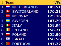 Lederlaget i OPEN, Nederland har fått opp en liten luke, 14 VP foran Sveits og 20 VP foran Norge.