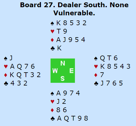 I lukket rom servet øst sp 3 til 9er og ess. Så kom samme hjerterbehandlingen men inne på hj K fortsatte van den Bos med kl J og Nord kom inn. Betheau prøvde deretter å godspille ruterfargen, men Van Lankveld sine signaler gjorde det lett for Øst å lasjere. Dermed fikk Nord også taperne sine i spar og gikk bet. I kampen lykkes Nederlenderne omtrent med alt og vant 68-3. De er nok favoritt til å vinne mesterskapet?