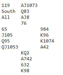 Ved begge bord kom Nord i 4 hjerter. Underveis hadde Ole Rimstedt i Vest sperremeldt 2 spar. Hva mener du, vinnes denne utgangen eller skal det ende med bet. I åpent tom valgte M. Rimstedt å spille ut kl J som gikk til kongen hos De Wijs i Nord. Trumf til esset fulgt av hj 5 til 9-r, 10-er og kongen var vellykket start for spillefører. I håp om singelton i ruter hos makker tok så Øst for ru A og fortsattte ruter, men den vant jo Nord med kongen, tok for hj D og hadde resten. Motspillet av Øst sviktet her.
