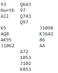 Det er klart nord hadde et håp om en gjenåpningsdobling fra syd. Dobler fra nord ville vært negativ dobling. Syd så imidlertid ingen grunn til å doble opp med dobbelton ruter og helt minimum. Dermed gikk de glipp av å kunne spille motspill mot 2 ruter doblet, eller glipp av en fin sparkontrakt hvis nord hadde meldt første gangen. Men står det i utgang N/S?