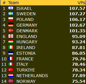 Damelaget vårt ligger fortsatt under middels, men lørdag slo de sterke Sverige såvidt før det også ble seier mot Irland. 14 plass så langt er langt fra forventningene, men det er kun 13 VP opp til 8.plassen (VM kvalik). I begge disse klassene er det fortsatt ikke halvspilt, så det er håp om klatiring på tabllen for de norske.