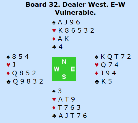 Marianne Harding og Ann Karin Fuglestad spilte 4 hjerter som N/S. Det ser ut som en nesten-slem dette, men med kun tre trumf hos syd blir det for vanskelig å vinne tolv stikk. Hvis spillefører løser trumfen (kongen fulgt av finesse) blir hun hengende med for mange spar. Riktig spill er vel å trumfe to spar og håpe trumfen ikke gir en taper. Men da blir det normalt en spartaper i tillegg til en trumftaper. Det ser nesten ut som de kan gå an å jobbe frem ett ekstra kløverstikk også, men det blir litt mye arbeid, og litt for kronglete. Det var kun noen svært få som vant tolv stikk i dette spillet, og de spilte utgang.