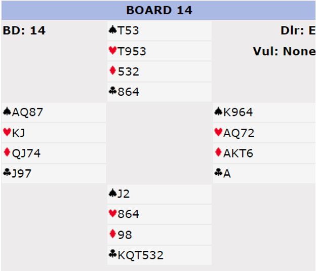 La oss innrømme det, her er kortene så perfekte mot hverandre at det med de fleste vanlige system er vanskelig å diagnostisere i meldingene at det er så perfekt. Både K-J i hjerter mot østs farge er helt perfekt, og Q-J i ruter nydelige kort, og i ruterkontrakt også helt supre kort, for eksempel knekten siden øst også har tieren.