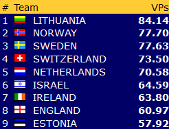 Norge - Polen 5,2 - 14,8 (IMP-score: 6 - 25) Norge - Bulgaria 20 - 0 (IMP-score: 83 - 13) Norge - Kroatia 18,44 - 1,56 (IMP-score: 59 - 16)