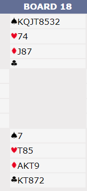 6 kløver er ganske bra. Det er forskjellige muligheter for spilleplan. Etter hjerterutspill stjal den nederlandske syd en hjerter, tok for A-K i ruter med sparavkast og spilte seg over til syd på spar ess. Så stjal han den tredje hjerteren med kløver ess, stjal en spar og spilte trumfkongen. Nå, etter at han hadde brukt trumfesset til å dekke opp en hjerter var han avhengig av enten singel knekt eller dame i trumf, eller 2-2 sits. Slik det satt ble det +1370 og nok en gang 13 IMP til Nederland da Norge noterte +620 i 5 kløver ved det andre bordet.