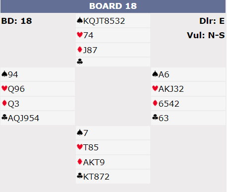 Ved begge bord ble kontrakten 5 hjerter doblet av øst etter at syd hadde vært i 4 spar. Spar konge kom i utspill fulgt av skift til trumf. Spillefører stakk på hånden og spilte ruter 10. Brogeland stakk med kongen og spilte spar som viste seg å være til dobbeltrenons. Spillefører stjal på bordet og kastet en kløver fra hånden. Det kan se ut som om det fortsatt skal kunne bli en kløvertaper, men det blir det ikke. Spillefører stjal ruter dame og kjørte i gang med hjerteren. Da den var oppbrukt hadde han kløver dame dobbel på hånden. Idet vest skulle ned på to kort på den siste trumfen lå det A-x i kløver og ruter knekt der borte. Foran bordet satt syd med ruter A og K-10 i kløver, og han måtte gå ned på to kort først. Syd ble skviset sønder og sammen, elleve stikk og +650 til Nederland.