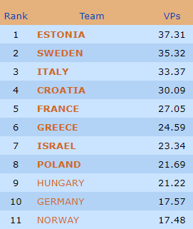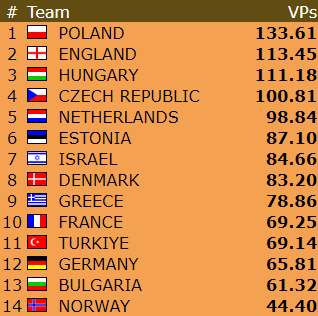 Etter to dager av Ungdoms EM leder de norske jentene i U26W-klassen. De har tapt to kamper, men fem solide seiere har gitt 97VP (snitt nesten 14VP per kamp) og omtrent 10VP ledelse foran Polen. Nederst i dette innlegget tar vi med et gladspill fra en av det norske lederlagets kamper.