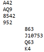 N/S har fem ruterstikk og ett kløverstikk å hente. Det var også flere Ø/V-par som gikk bet i 3NT, noen av dem gikk to bet (N/S +200), og noen gikk bet i delkontrakter i grand.