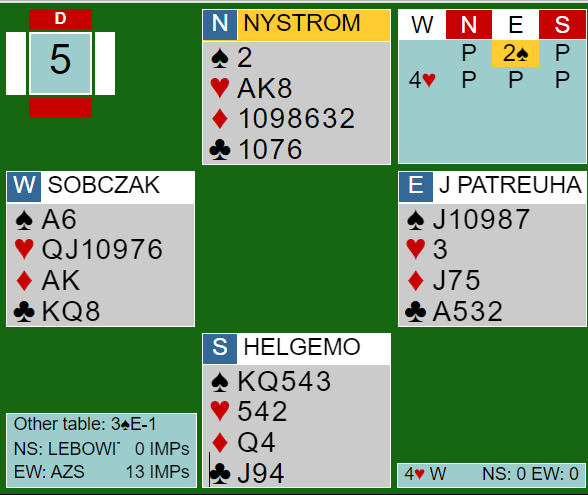 Sobsczak ved det andre bordet hadde helt andre ambisjoner. Direkte over østs 2 spar meldte han 4 hjerter! Det har mye for seg. Hvorfor spille på 5-2 tilpasning i spar når man har en så sterk hjerterfarge?